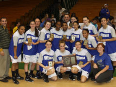 Las ex-alumnas del equipo Blue Waves regresan al gimnasio de la Escuela Secundaria de Riverhead el 17 de marzo